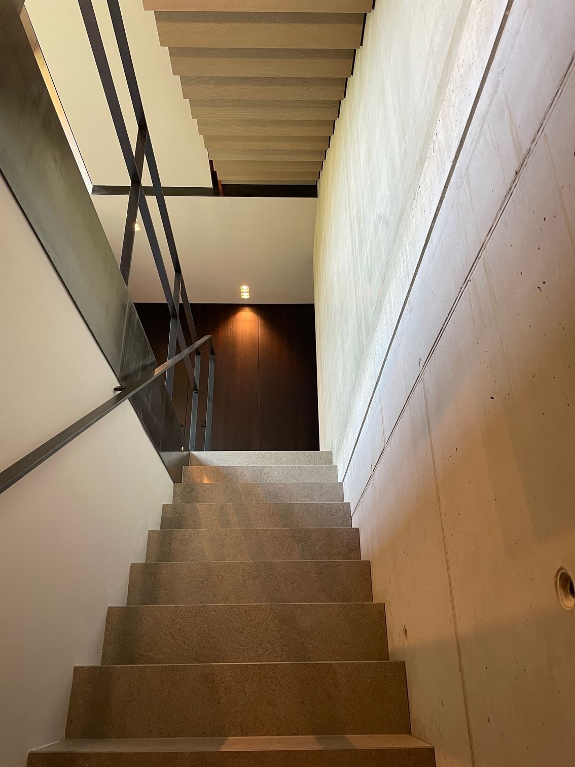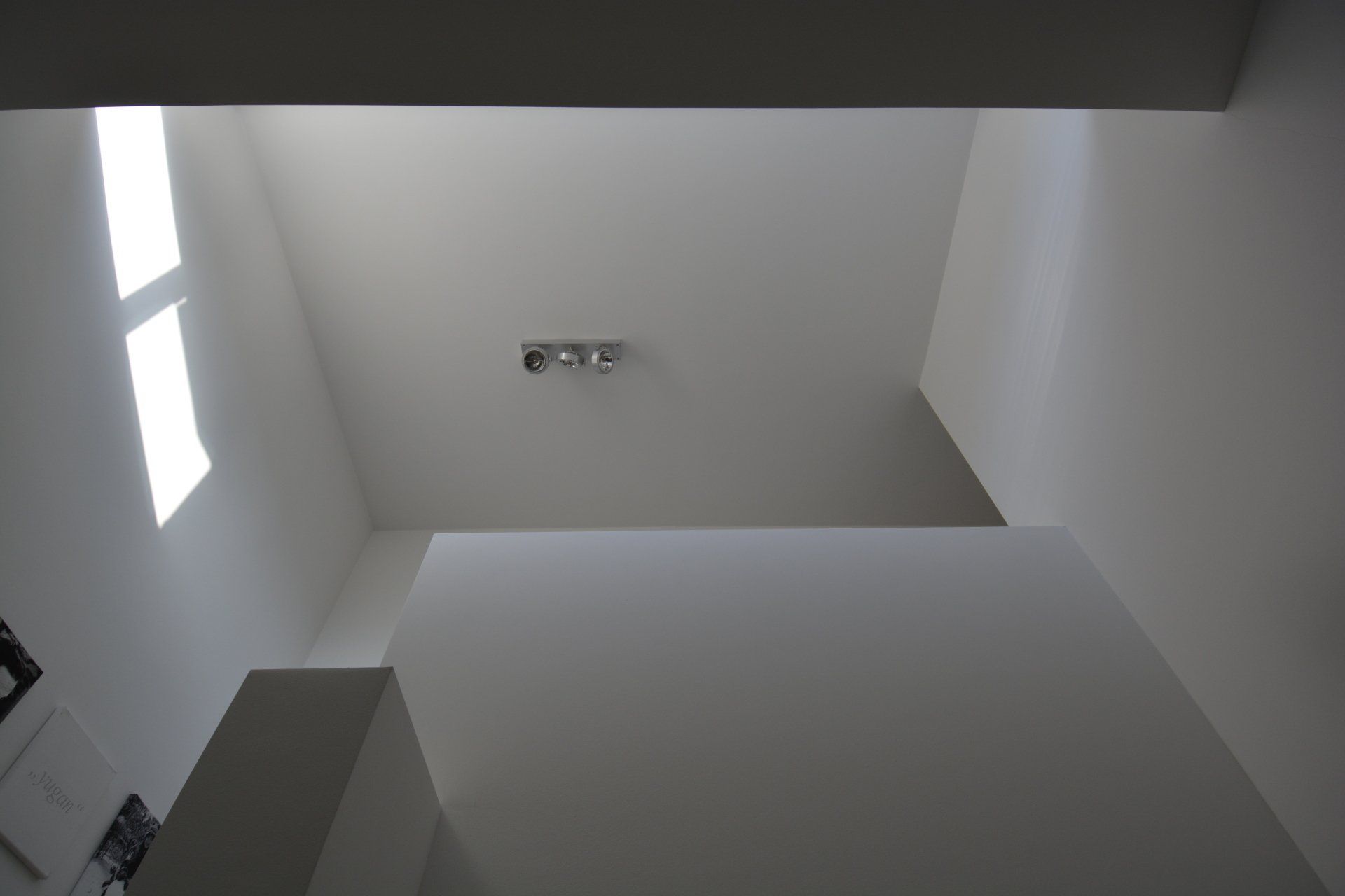 Bei Betreten des Hauses jedoch offenbart sich eine kompromisslos moderne Innenwelt, offen fließen die Lebensbereiche Kochen, Essen und Wohnen ineinander, im völligen Kontrast zum äußeren Umfeld ist das Innere geprägt von weiten Blickachsen und einem offenen zentralen zweigeschossigen Luftraum, in dem eine Sichtbetonwand emporragt.
